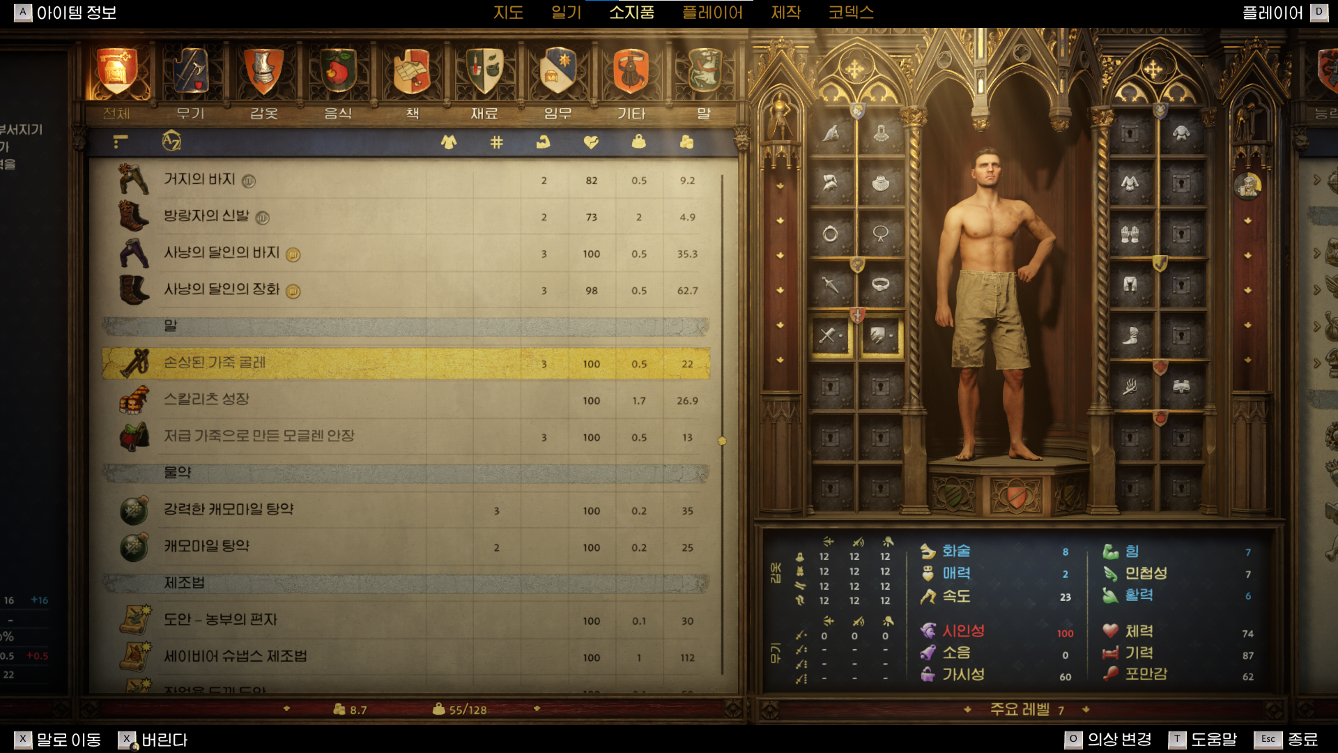 인벤트리에 있는 말 탭의 아이템들을 x키로 말에게 옮겨 위의 말 탭에서 말에게 착용시켜주세요.