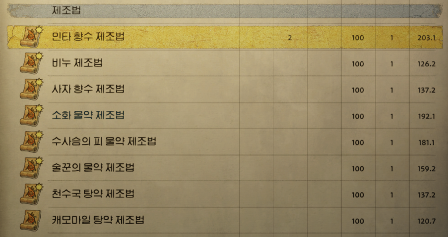 연금술 레시피는 종류가 많기 때문에 컨트롤+f 키로 검색하시면 편합니다. 캐모마일 탕약민타 향수 세이비어 슈냅스