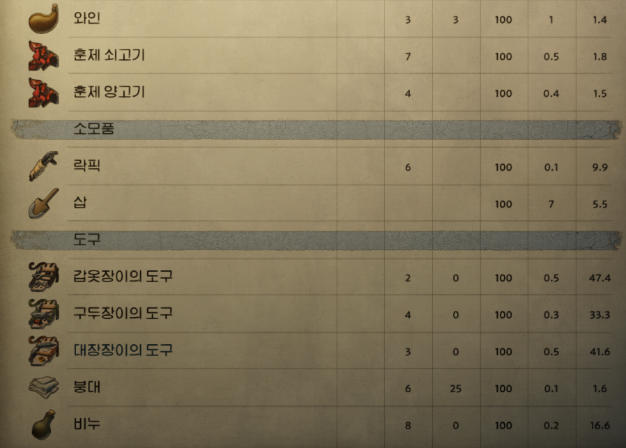 상인들이 파는 품목을 모두 정리해놔서 글이 꽤 깁니다. 원하시는 정보는 컨트롤+f키로 검색해서 찾으시면 편합니다.